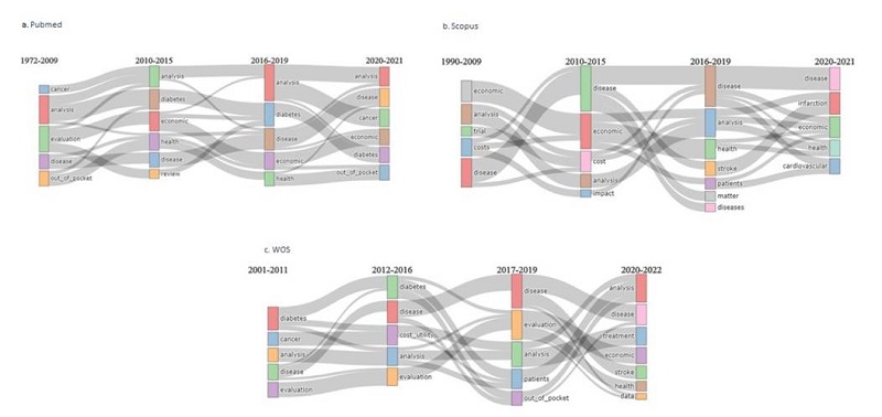 En WoS, figura 2c, se comprueba que desde el periodo 2001-2011 predomina el interés por los términos diabetes y cáncer mediante las evaluaciones y análisis como método de investigación, pero en el periodo 2012-2016 surge un término diferente que no estaba incluido en las bases de datos anteriores y es costo-utilidad, que mantiene relación en el periodo 2016-2019 con los estudios de tipo análisis y en este se muestra la inclusión de los gastos de bolsillo en los temas de interés, manteniendo su conexión en el periodo 2020-2022 (periodo 4) con la categoría análisis. También llama la atención la permanencia en el tiempo de la relación con el término tratamiento en el periodo 4 con las categorías de análisis, costo-utilidad y diabetes.