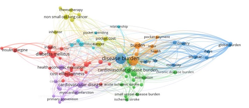 Se obtuvieron siete nodos de información: en el primero (color rojo) la palabra más repetida fue diabetes (frecuencia = 85) con relación a las evaluaciones económicas en salud, análisis de costo-beneficio, costo-efectividad, costos directos, gastos de bolsillo y carga de la enfermedad. En el segundo (color verde), el término fue carga de enfermedad de la enfermedad cardiovascular (frecuencia = 80). Con relación a la carga de enfermedad de las enfermedades crónicas, predomina la conexión con las enfermedades cerebrovasculares. En el tercer nodo (azul) el término que más pesa es carga de enfermedad (frecuencia = 227) que mantiene correspondencia con la mayoría de los nodos representados. Se destacan ENT como diabetes, cáncer (de pulmón), infarto, enfermedad cardiovascular, evento cerebrovascular y términos relacionados con las evaluaciones económicas como QALY, calidad de vida y discapacidad. Cáncer es la voz más representativa del cuarto nodo (color amarillo, frecuencia = 51) y tiene relación con gastos de bolsillo y cáncer de células no pequeñas. El quinto nodo lo representa el término enfermedad cardiovascular (color morado, frecuencia = 66) y guarda relación con los ítems de prevención primaria y secundaria, evaluaciones económicas en salud, costos indirectos y se destaca el infarto agudo de miocardio como resultado de las ENT. En el sexto nodo (color azul claro) la locución más repetida es fibrilación auricular (frecuencia = 36), que guarda relación con gastos de bolsillo y prevención de enfermedad cerebrovascular. El nodo siete (color naranja) se asocia con la mayoría de los nodos por su palabra más repetida: enfermedad (frecuencia = 275), se destaca su conexión con salud, gastos de bolsillo y carga de enfermedad.