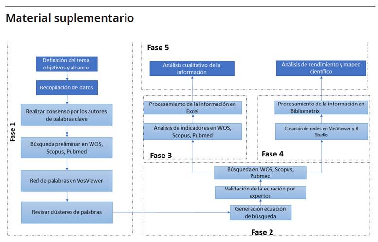 Se realizó una investigación bibliométrica mediante las bases de datos Web of Science (WoS), PubMed, Scopus y Literatura Latinoamericana y del Caribe en Ciencias de la Salud (Lilacs). El periodo de búsqueda fue la evidencia científica disponible hasta el 31 de agosto de 2021. La metodología se desarrolló con el proceso propuesto por Donthu N et al. (2021) y se presenta en la figura 1-MS (material suplementario) 9.