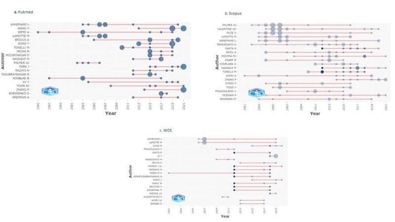 Por otro lado, la figura 2B-MS y 2C-MS (material suplementario) permite identificar que, en los últimos 20 años, los cinco autores con más producción científica han sido constantes en la publicación de artículos con el tema de las ENT y las evaluaciones económicas en WoS y Scopus, pero se evidencia una disminución en la producción científica de estos autores en 2021. En la figura 2A-MS (material suplementario), PubMed Wang Y inició la producción científica en 2013 y ha sido el único que ha continuado hasta el 2021. A diferencia de las otras bases datos el autor Lamotte M tuvo un periodo de producción más corto: 2003-2007.