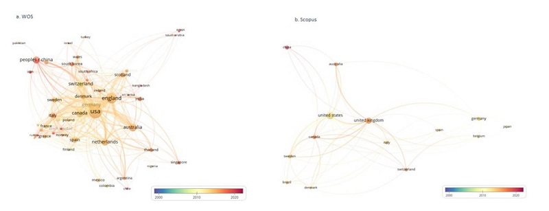 La figura 3 A-MS (material suplementario) sobre relaciones de coautoría de países y regiones mostró ocho grupos en WoS: 1) Bélgica, Brasil, Croacia, República Checa, Dinamarca, Finlandia, Francia, Alemania, Grecia, Hungría, Italia, Noruega, Polonia, Portugal, Rusia, Serbia, Eslovenia y España; 2) Bangladesh, Egipto, Inglaterra, India, Nueva Zelanda, Arabia Saudita, Escocia, Sri Lanka y Emiratos Árabes; 3) Australia, Malasia, Países Bajos, Nigeria, Singapur y Tailandia; 4) Argentina, Chile, Colombia y Estados Unidos; 5) Canadá, Irán, Israel, Suecia y Gales; 6) Japón, Pakistán, China, Corea del Sur y Taiwán; 7) Sudáfrica, Suiza y Turquía; 8) Austria, Irlanda. En Scopus mostró tres grupos: 1) Bélgica, Alemania, Italia, Japón y España; 2) Brasil, Canadá, Dinamarca, Suiza y Suecia; 3) Australia, China, Reino Unido y Estados Unidos.