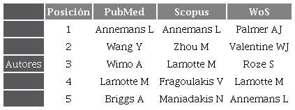 En la tabla 1 se identifican los autores que más documentos han publicado en cada base de datos en torno a las evaluaciones económicas y las ENT. Por ejemplo, en PubMed y Scopus el autor con más documentos publicados fue Lieven Annemans, de la Universidad de Gent (Ghent, Belgium), máster en Ciencias de la salud y doctorado en Economía, ha trabajado en compañía de Mark Lamotte, cardiólogo y líder mundial en economía de la salud e hipertensión arterial en IQVIA1