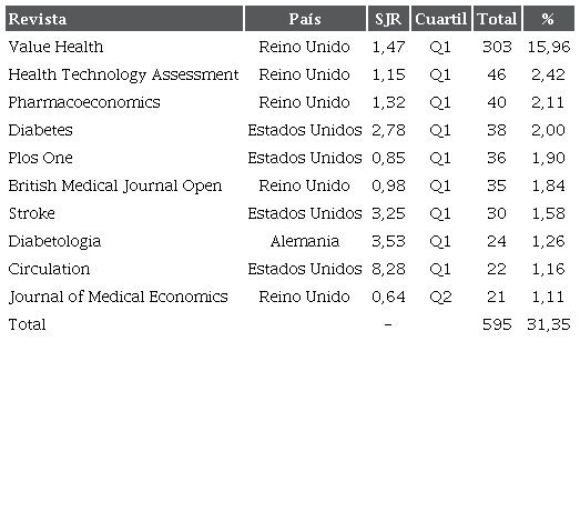 En esta lista se advierte que Value in Health es la principal revista con producción científica del tema, contiene artículos de investigación en farmacoeconomía, economía y políticas en salud, lo cual la convierte en un importante medio de divulgación científica de las ENT y las evaluaciones económicas. Además, se observa que todas las revistas, excepto Journal of Medical Economics (Q2), están clasificadas en Q1 por el Scimago Journal Ranking (SJR). Por último, las revistas Circulation y Stroke tienen el mayor SJR, aunque no se encuentran en los primeros lugares de revistas con más publicaciones, los temas principales son salud y enfermedad cardiovascular en la primera, y en la segunda cualquier aspecto de las enfermedades cerebrales incluyendo varias disciplinas.
