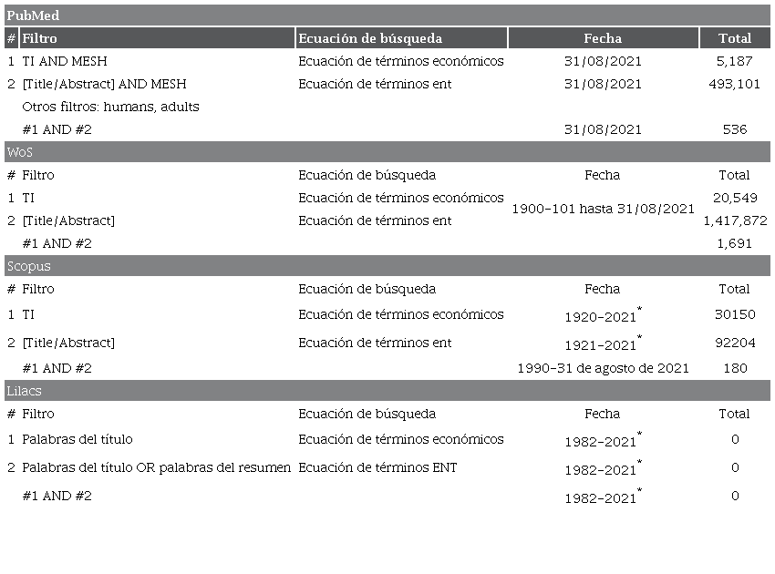 En la ecuación de búsqueda se utilizó el filtro título para los términos económicos y en lo correspondiente a las ENT título y resumen, como estrategia para que los resultados fueran más específicos acordes con la pregunta de investigación. A continuación, se mencionan las palabras clave utilizadas: