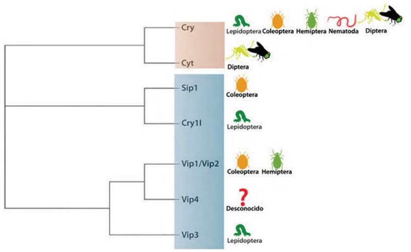 Los biocontroladores son productos de origen biológico que actúan como antagonistas frente a microorganismos patógenos que producen daño en los cultivos 58. Un ejemplo es la bacteria entomopatógena Bacillus thuringiensis, capaz de producir una amplia variedad de proteínas insecticidas letales para distintos órdenes de insectos. Por su eficacia, bajo impacto ambiental negativo y alta especificidad, los insecticidas biológicos más vendidos son aquellos basados en proteínas de Bacillus thuringiensis, que actúan exclusivamente previa ingestión del insecto y no por contacto en superficie 59. Se caracteriza por ser un bacilo grampositivo, aerobio facultativo, esporulado, cuyo tamaño oscila entre 1 a 1,2 micrómetros de ancho y de 3 a 5 micrómetros de largo, nativo del suelo y catalogado como cosmopolita, la cual se ha aislado de ecosistemas como bosques tropicales y templados, zonas desérticas, sabanas, archipiélagos, frutales, suelos agrícolas, arena y cuevas en los cinco continentes. Pertenece al reino Eubacteria, a la familia Bacillaceae y al género Bacillus junto con B. cereus y B. anthracis, de los cuales se diferencian por la formación de una inclusión parasporal refringente al microscopio de contraste de fases 60.