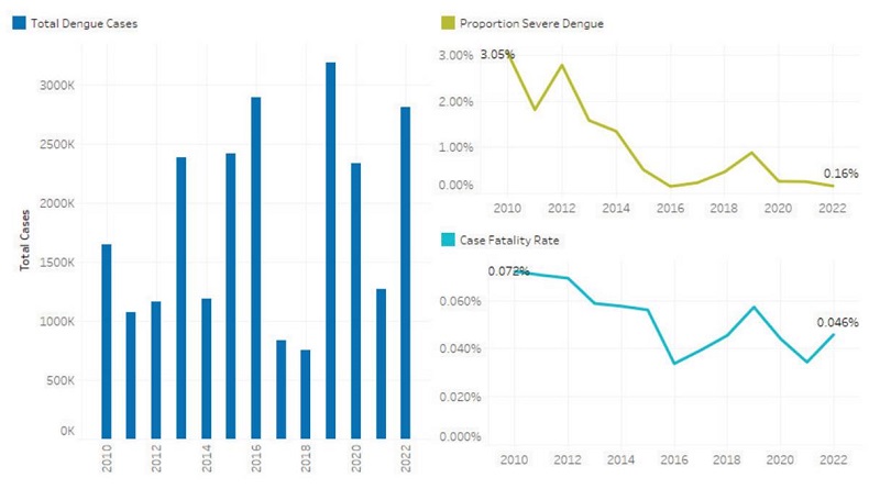 A nivel mundial, en comparación con el año anterior, hay un crecimiento. El mayor número de casos de dengue en la región lo han reportado los siguientes países: Brasil con 2 363 490 casos (84,0 %), Nicaragua con 97 541 casos (3,5 %), Perú con 72 851 casos (2,6 %), Colombia con 69 497 casos (2,5 %), and México con 59 918 casos (2,1 %) 79.