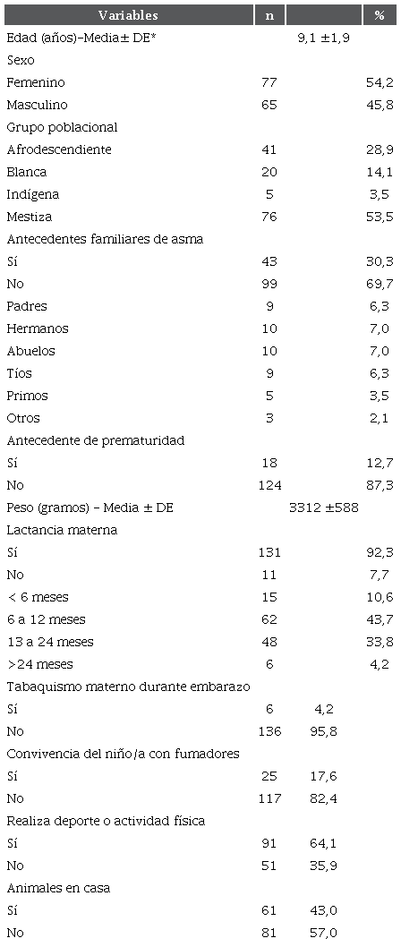Lo reportado por los padres, con respecto a los antecedentes de los niños y niñas fue que el 30,3 % (n = 43) tuvo antecedentes familiares de asma, con predominio de los hermanos y abuelos en un 7,0 % (n = 10). Solo el 12,7 % (n = 18) presentó antecedente de prematuridad, y el peso promedio de nacimiento fue de 3312 ± 588 gramos. El 7,7 % (n = 11) afirmó que no se brindó lactancia materna al menor. Por otra parte, el 4,2 % (n = 6) dijo que la madre había fumado durante el embarazo y el 17,6 % (n = 25) aseguró que el/la niño/a estuvo expuesto/a en espacios donde había fumadores. Para el momento en el que se aplicó la encuesta el 43,0 % (n = 61) dijo tener una mascota (tabla 1).