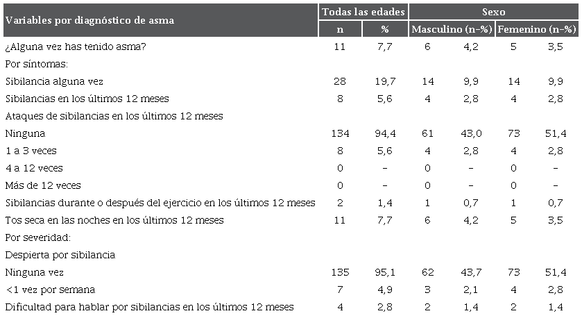 Por otro lado, se encontró una presencia de asma del 5,6 % y una tasa acumulada a lo largo de la vida del 19,7 % (14 niños y 14 niñas). De este porcentaje, el 39,2 % de los participantes tiene diagnóstico de asma, mientras que el 60,8 %, no. No se encontró una diferencia estadísticamente significativa entre la edad de los participantes y la aparición de sibilancias (p = 0,934); además, solo el 2,8 % presentó asma severa (2 niños y 2 niñas) (tabla 2).