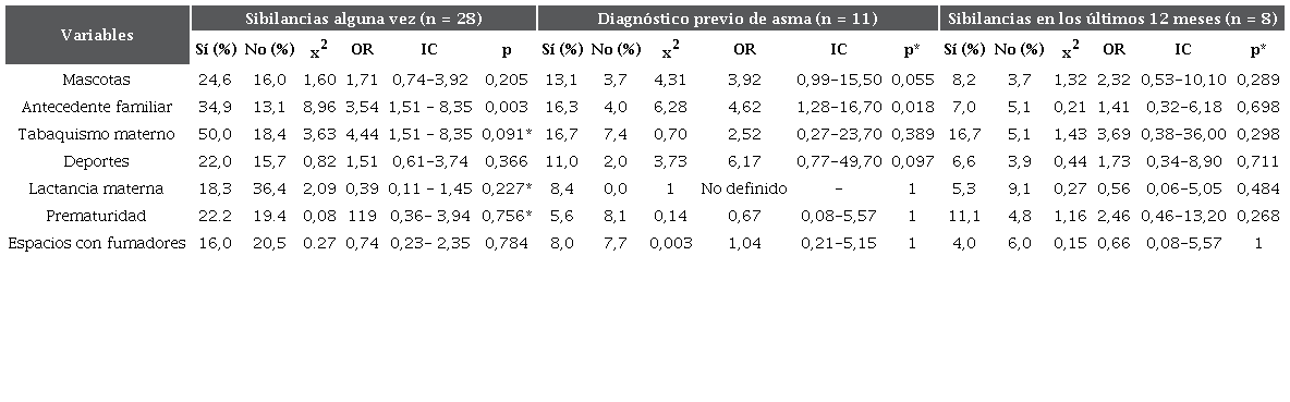 Se encontró que el antecedente familiar de asma representaba un factor de riesgo para la presencia de sibilancias alguna vez, y para un diagnóstico previo de asma. Los resultados del cruce de variables se pueden ver en la tabla 3.