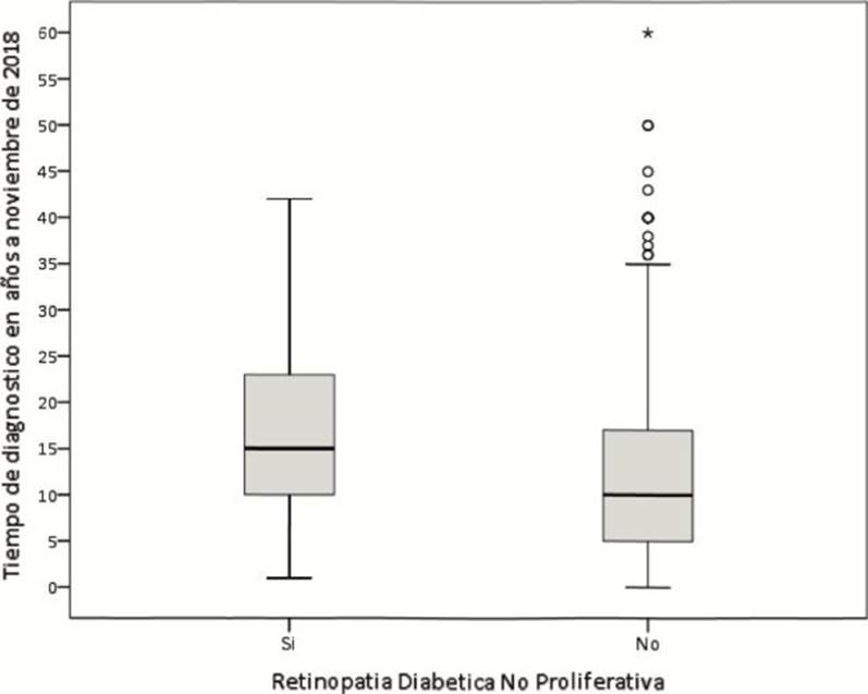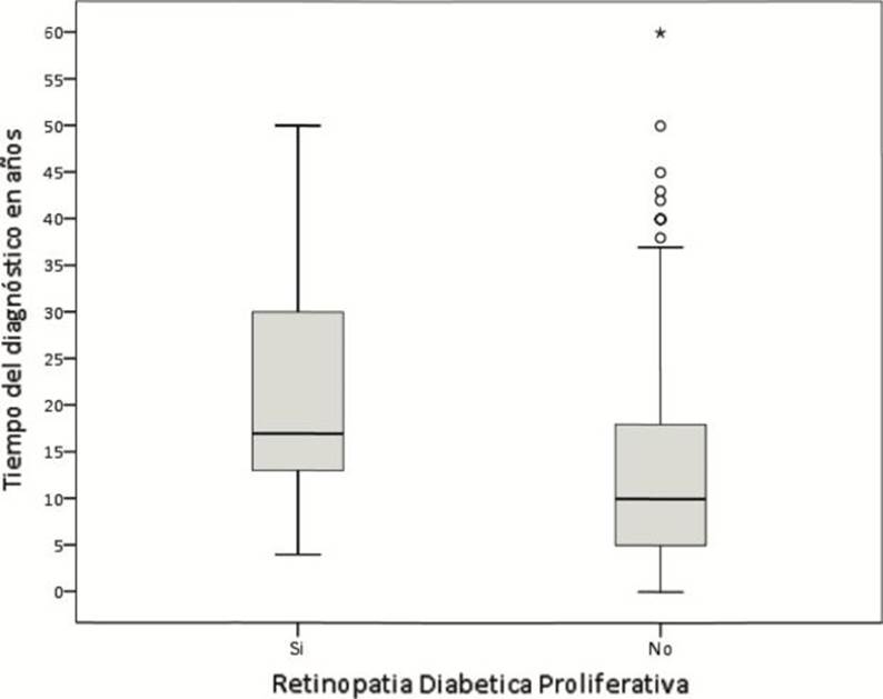 El tiempo de años del diagnóstico fue de 21,58 (+/- 13,20) para los que tenían retinopatía diabética proliferativa; la mitad de ellos tenía 17,5 años o menos (Rq = 21); entre tanto, los que no la tenían fue de 18,14 años (+/9,95), y la mitad, 17,0 años o menos (Rq = 16), de haber sido pronosticados con la enfermedad (figuras 1a y 1b).