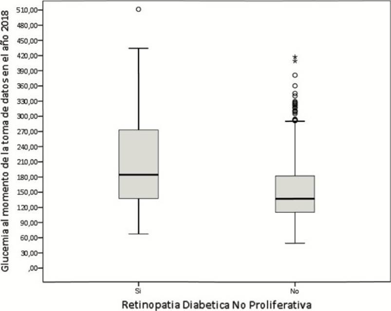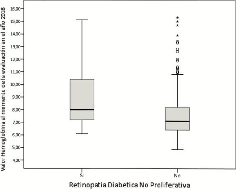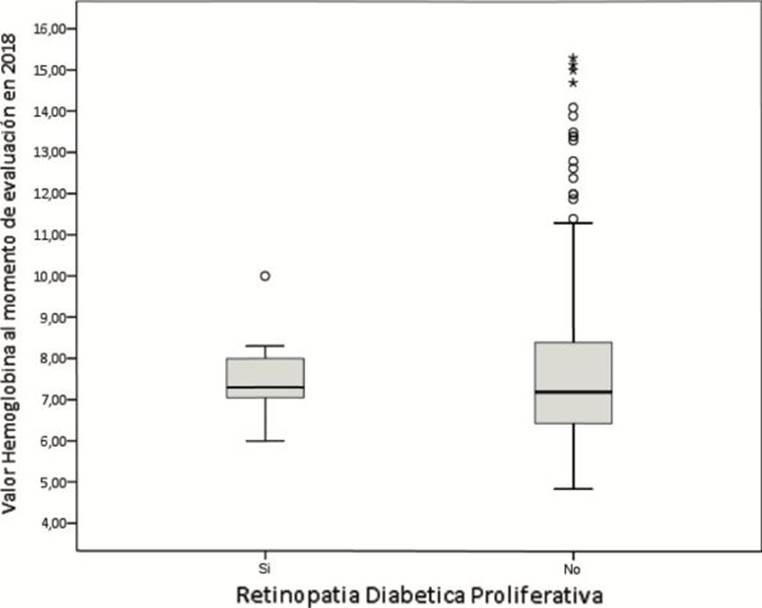 El valor de la hemoglobina glicosilada fue menor en personas con retinopatía diabética proliferativa, con valores promedio de 7,48 (+/- 1,07); la mitad mostró valores de 7,3 o menos (Rq = 1,03); mientras, para los diagnosticados con no proliferativa fue de 8,79 (+/- 2,27), y los valores para la mitad de ellos, fueron de 8,0 o menos (Rq = 3,08) (figuras 1e y 1f).