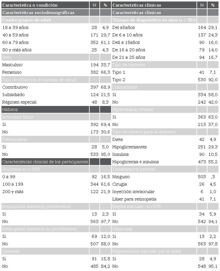 El 63,0 % (353) refirió alguna forma de hipertensión y el 58,0 % (334) dislipidemia. En cuanto a las patologías oculares, se registró que un 15,8 % (91) tenía cataratas, el 2,2 % 13 glaucoma y el 4,9 % (28) degeneración macular para la edad (tabla 1).