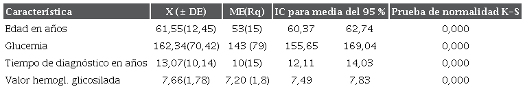 Asimismo, se observó que la mitad de la población estudiada tenía 63 o menos años (Rq = 15), y se identificó que los valores de glicemia tomados en el momento de la atención eran de 143 mg/dl o menos (Rq = 79) para la mitad de ellos (tabla 2).