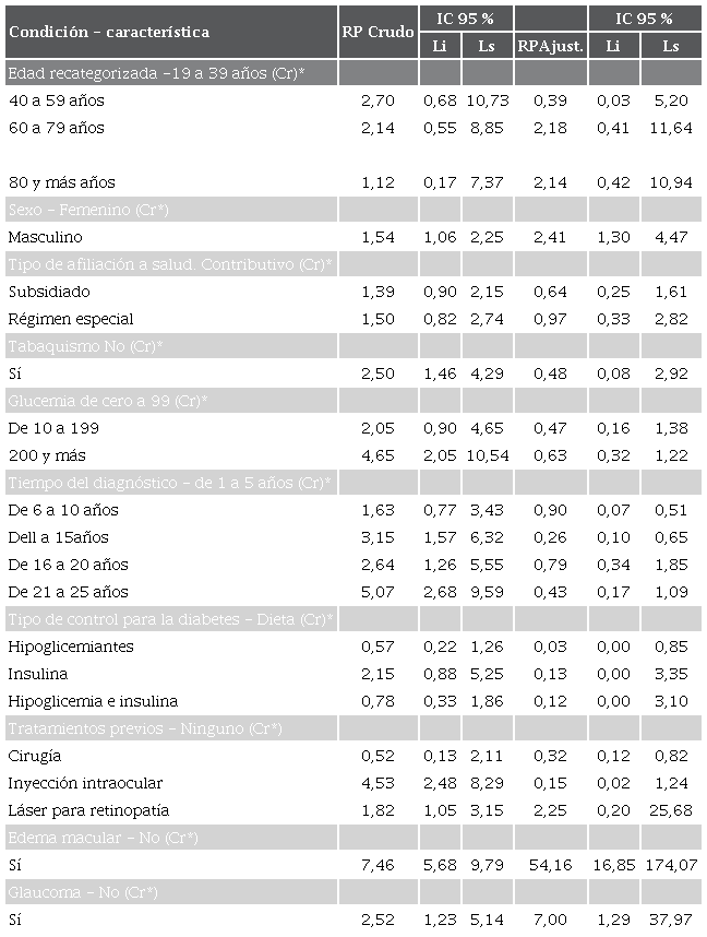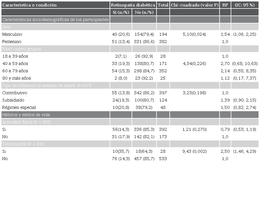También se advirtió una mayor prevalencia de retinopatía diabética en quienes estaban afiliados al sistema de salud, vía régimen especial (RP = 1,50), y en los afiliados al régimen subsidiado (RP = 1,39) (tabla 3).