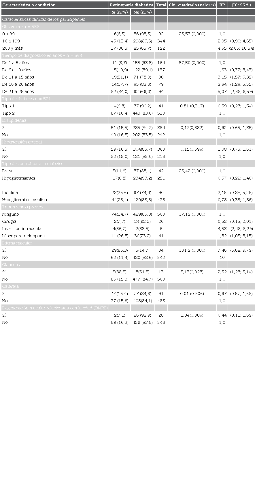 Se identificaron asociaciones estadísticamente significativas (p < 0,05) entre los niveles de glucemia en ayunas y la retinopatía diabética: esta es 2,05 veces mayor en diabéticos con niveles de glucemia entre 100 a 199 mg/dl y 4,65 en aquellos con niveles por encima de 200 mg/dl, y con el tiempo de diagnóstico, ya que la prevalencia de retinopatía diabética fue 0,63 veces mayor en los que tenían de 6 a 10 años, 2,15 veces mayor en los que tenían de 11 a 15 años, 1,64 veces mayor en quienes tenían de 16 a 20 años, y 4,07 veces mayor en los que tenían de 21 a 25 de años diagnóstico (tabla 4).