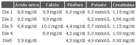 La paciente fue hospitalizada en observación general, se indicó manejo con hidratación vigorosa con cristaloides (solución Hartman), en dosis de 2 cc/kg/h; alopurinol, dosis de 10 mg/kg dividido en tres dosis, y resinas de intercambio catiónico, en dosis de 15 g, vía oral, cada ocho horas. Se optimizó el tratamiento analgésico con opioides, hidromorfona, para controlar los síntomas.