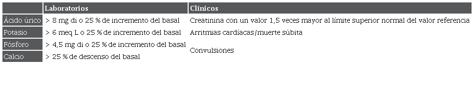 Los síntomas son consecuencia de alteraciones electrolíticas como: náuseas, vómito, diarrea, letargia, mialgias, calambres, parestesias, tetania, convulsiones, arritmias cardíacas, síncope 1,3. El fosfato de calcio puede precipitarse en el cuerpo y formar calcificaciones ectópicas, principalmente cuando hay reposición endovenosa de calcio. Esto es importante, debido a que puede haber precipitación en el sistema de conducción cardíaco, lo cual puede desencadenar arritmias 2. El diagnóstico del SLT se basa en los criterios de Cairo-Bishop, revisados por Howard, consistentes en las anormalidades electrolíticas características de la enfermedad, como: hiperkalemia (> 6 mEq/L o aumento de > 25 % de base), hiperuricemia (> 8 mg/dl o aumento de > 25 % de base), hiperfosfatemia (> 4,5 mg/dl o aumento de > 25 % de base) e hipocalcemia (< 7 mg/dl o descenso de > 25 % de base), que ocurre tres días antes del inicio de la quimioterapia y hasta siete días después. Los criterios clínicos de la enfermedad incluyen la presencia de lesión renal, arritmias cardíacas o convulsiones 3,5.