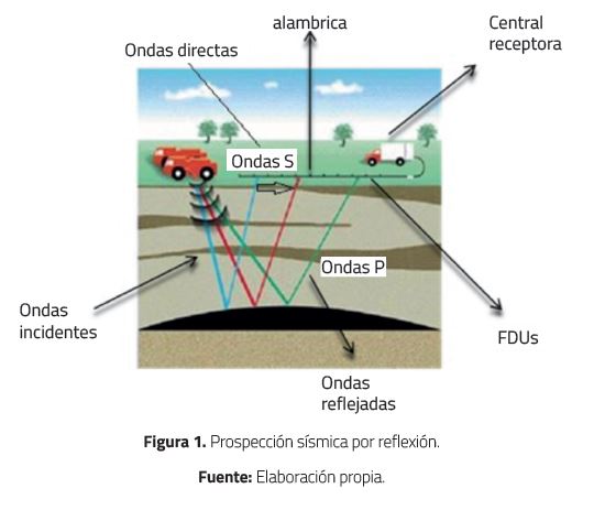 Como se muestra en la Figura 1, mediante el método sísmico por reflexión profunda se emiten ondas de sonido desde camiones vibradores en tierra, cañones de aire en cuencas submarinas o explosiones controladas con cargas de pentolita enterradas. Las ondas generadas se propagan a través de formaciones geológicas con propiedades físicas diferentes en su composición y densidad; estas diferencias en propiedades, generan contrastes en la velocidad de propagación de las ondas y por consiguiente patrones diferentes de longitud de onda de una línea de reflexión (roll-along). Las señales reflejadas son detectadas por grupos de geófonos de superficie; posteriormente son transmitidas a una estación central de registro, en donde son grabadas en cintas magnéticas.