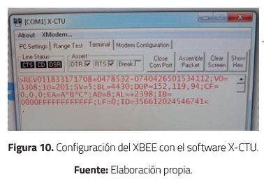 Como se muestra en la Figura 10, se programó los XBEE con la ayuda del software X-CTU: el número de serie es una dirección única de la radio, y se usa para enviarle mensajes; después se instalaron los driver correspondientes para que el software pueda leer el puerto de comunicación, en este caso el (COM 1), y al otro PC se configura el segundo XBEE que correspondía al puerto (COM 4). Además, se ajustó la tasa de baudios a 9.6Kbps. El siguiente paso fue configurar los XBEE para una transmisión serial transparente (modo AT).