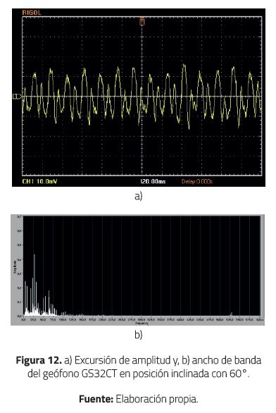 De estos datos se puede inferir que aumenta el valor de R con la inclinación del geófono; así mismo, disminuye el factor de calidad del circuito y se incrementa el ancho de banda. En la Figura 12a se evidencia el rango dinámico de la señal oscilante tomada a la salida del sensor para una posición del geófono con inclinación de 60° con respecto a la normal.