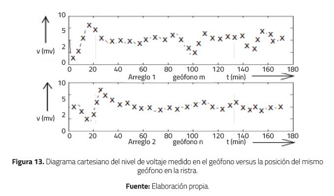 Del comportamiento de las curvas de la Figura 13 se puede afirmar que existe una correlación entre las inclinaciones experimentadas con las posiciones de los geófonos m y n, y los niveles de voltaje recibidos en la estación de registro central. Esta información fue fundamental y preliminar al desarrollo de las pruebas de telemetría de datos obtenidos por el método prospección sísmica por reflexión.