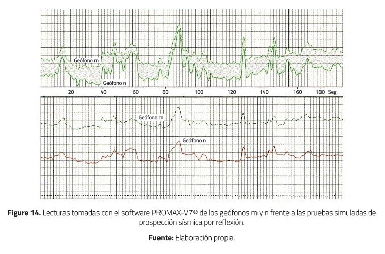 Como se muestra en la Figura 14, la recepción de los datos de registro representados en trazas continuas en función del tiempo evidencia una gran similitud entre los geófonos m y n, lo cual indica isotropía del medio (tierra arcillosa, arenosa y rocosa depositada en la maqueta), y un estrecho espaciamiento entre los sensores (10 cm), que efectivamente se presentó en el momento de las pruebas.