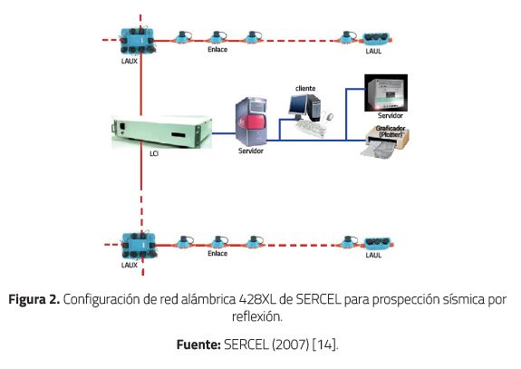 La red 428XL de SERCEL, en configuración bus, y con arquitectura cliente/servidor, es una de las más usadas; como lo muestra la Figura 2, está conformada por unidades de sensor digital (DSU), unidades digitalizadoras de campo (FDU), enlace por unidades de campo dedicadas (LAULs), unidades de adquisición de línea de cruce (LAUX), interfaz entre el tendido y la estación de registro central (LCI).
