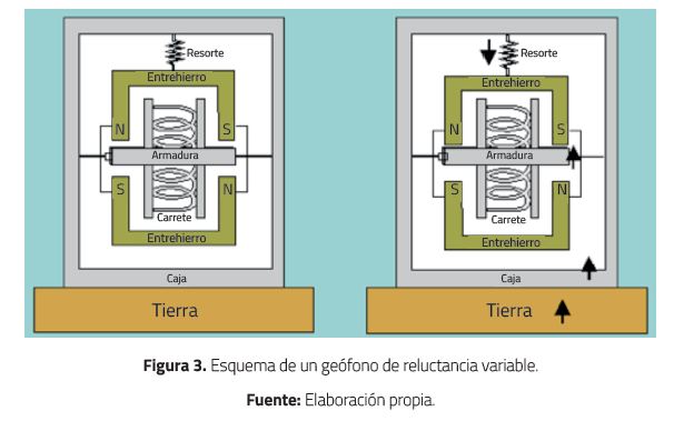 Son transductores sensibles de vibraciones mecánicas a señales eléctricas; estos se clasifican en electromagnéticos, de reluctancia variable y capacitivos [15]. Para la exploración petrolera por sísmica por reflexión, los más usados son los geófonos electromagnéticos y de reluctancia variable, este último fue utilizado en la investigación y está constituido de resorte-bobina, imán permanente y armadura (ver Figura 3).