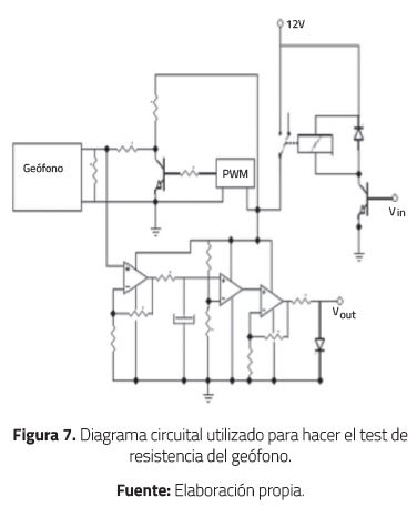 Para el diseño del circuito de test de voltaje del geófono, se caracterizó el sensor; para lograr este propósito, se recurrió a su frecuencia de resonancia. Este método es alternativo a medir la respuesta del geófono a un pulso, y guardarlo como modelo para pruebas de inclinación de los demás sensores. Se excitó el geófono GS32CT con una señal senoidal AC (Vpp=200mV, F=8Hz) en distintas posiciones y se tomaron las medidas que se presentan más adelante. El test de voltaje del geófono se llevó a cabo en los módulos esclavos mediante el circuito que se muestra en la Figura 7.