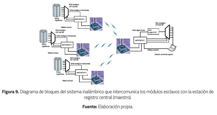En la Figura 9 se muestra el diagrama de bloques del sistema de comunicación inalámbrico bidireccional punto a punto, que interconecta la estación central de registro con los tres nodos de la red, en una configuración maestro-esclavo, y sobre la cual se hicieron las pruebas.