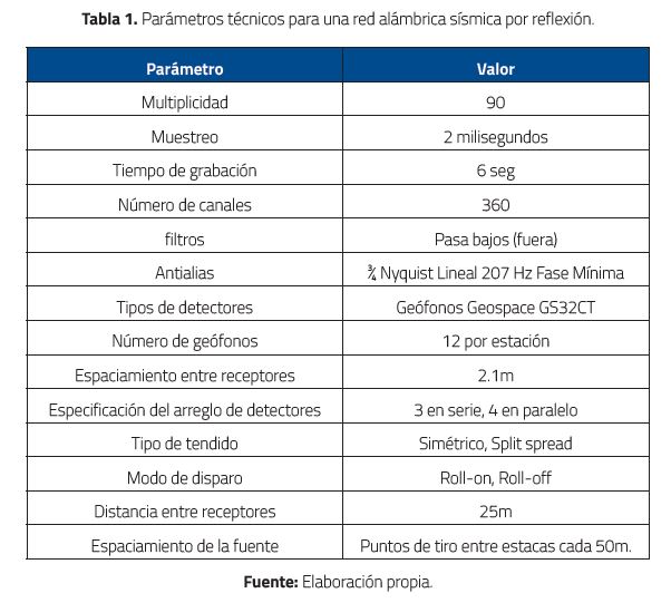 Los parámetros técnicos de la Tabla 1 son algunos de los utilizados en adquisición sísmica mediante grillas 2-D: