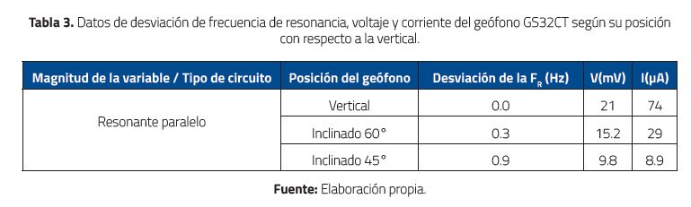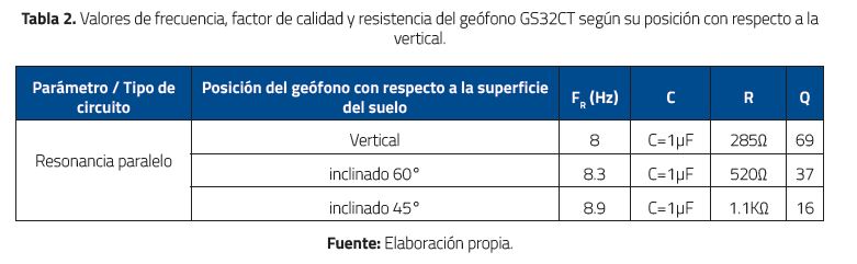 De los valores de la señal eléctrica recuperados en la estación central se concluye que se pierde selectividad en el circuito resonante a medida que el geófono se inclina hacia la superficie de la tierra, y que al aumentar la resistencia, los niveles de voltaje son apreciables para considerarse como una buena referencia cuando se trata de evaluar el error de posición del geófono.