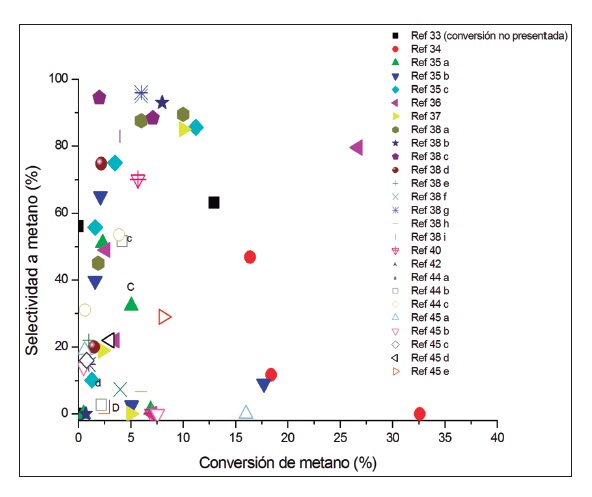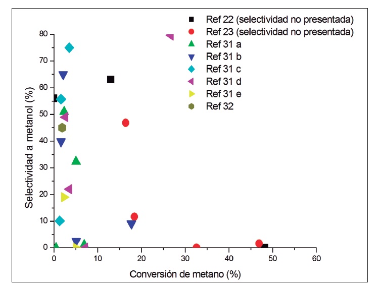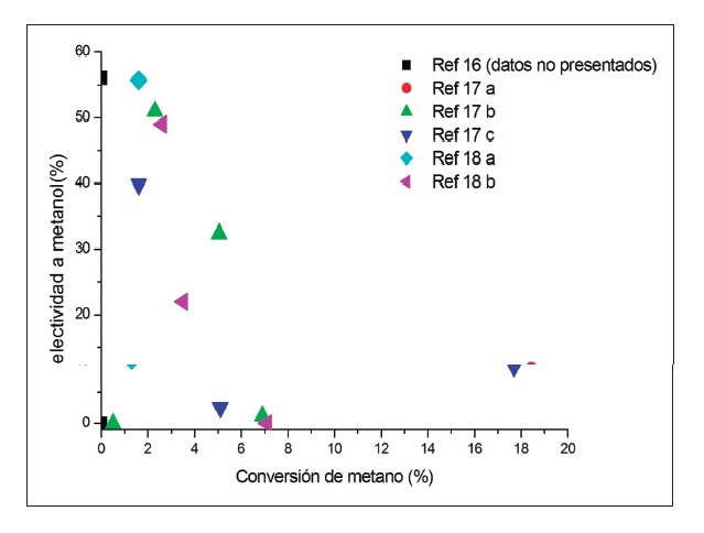En la Fig. 3 se resumen los resultados más relevantes de conversión de metano versus la selectividad a metanol; las dos unidades expresadas en porcentaje en moles. Es importante mencionar que dos de las referencias citadas no exhiben valores de selectividad a metanol; sin embargo se presentan, porque sí reportan valores de conversión de metano empleando óxidos metálicos como el cromo, zinc y molibdeno.