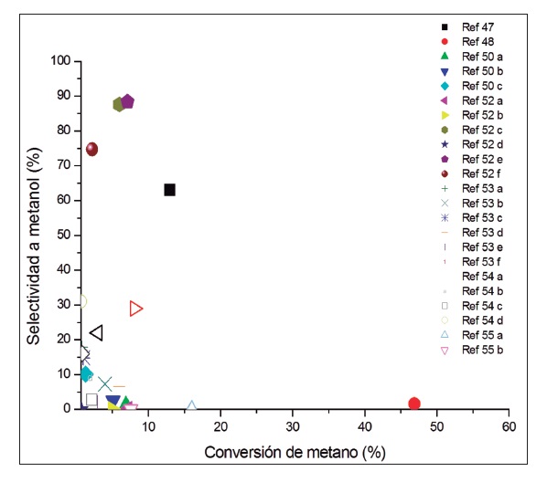 De acuerdo con lo anterior, se evidencia la gran cantidad de trabajos y la inclusión de diferentes tipos de materiales catalíticos, así como la variación de las condiciones de re-acción en busca de altos valores de conversión y selectividad a metanol. En la Fig. 4 se presentan los resultados de conversión de metano y selectividad a metanol expresados en porcentaje en moles.