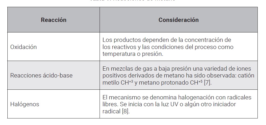 Las reacciones principales en las cuales interviene el metano se presentan en la Tabla 1. Se destaca que las oxidaciones parciales son difíciles de controlar y normalmente ocurren de manera completa, y esto genera como producto dióxido de car-bono y agua.