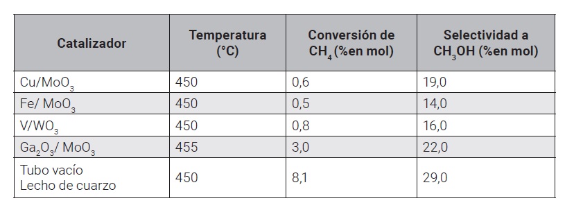 En los años 60 y 70, algunos investiga-dores sugirieron que aunque la oxidación de metano a metanol es factible, la cinética del proceso indica que la reacción homogénea en fase gaseosa favorece la formación de formaldehído en lugar de metanol. También encontraron que la formación de metanol se favoreció cuando fue catalizada por Cr2O3 sobre piedra pómez [25]. Los resulta dos obtenidos a 430 °C y 1,5 atm revelaron que el 12,5 % del metano que reacciona se convierte en metanol. En estos ensayos, se utilizó aire como fuente de oxígeno, manteniendo una relación entre metano y oxígeno de 10:1. Una conversión significativa de CH4 se presentó con perlas de vidrio, 10,3 % en mol, aunque también se registró que la selectividad era principalmente a óxidos de carbono. Se destaca que la presencia del catalizador, aunque no afecta la oxidación del metano, aumentó sustancialmente la selectividad a metanol [25].