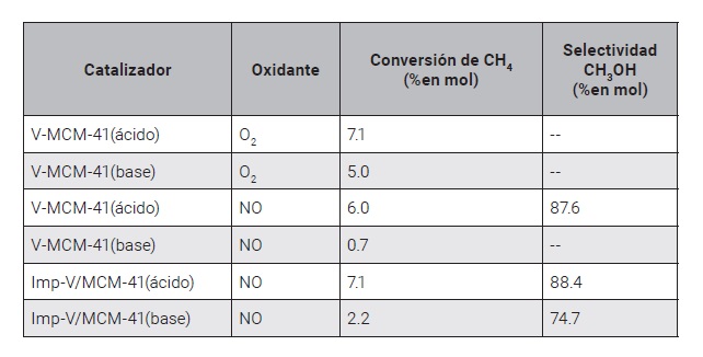 Por otra parte, el efecto de las estructuras de óxidos de vanadio sobre las propiedades fotocatalíticas para la oxidación parcial de metano a metanol fue estudiado; se prepararon tamices moleculares mesoporosos que contenían vanadio bajo condiciones ácidas y básicas, empleando el método de impregnación [50]. Se destaca que los sistemas fotocatalíticos ofrecen la posibilidad de promover muchas reacciones difíciles, incluso a temperatura ambiente, lo cual trae ventajas como bajo consumo de energía, estabilidad del catalizador y seguridad del reactor [50]. Los resultados más relevantes se encuentran en la Tabla 3, en la cual se puede ver que la mayor selectividad para el metanol fue 87,6 % en mol con una conversión de metano del 6,0 % en mol.