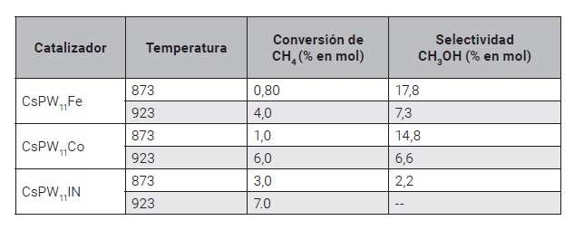 De la misma manera, la oxidación parcial de metano mediante oxígeno molecular y óxido nitroso fue estudiada en presencia de cantidades catalíticas de hetero-polioxo-metalátos de fórmula general [PW11MO39](7-n) donde M= Co(II), Ni(II) y Fe(III). La reacción de oxidación se realiza a presión atmosférica y a temperaturas entre 500°C y 650°C. Los principales productos de reacción observados fueron metanol, formaldehído, óxi-dos de carbono y agua [51].