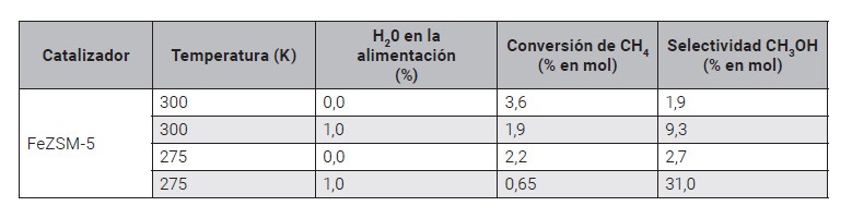 Por otro lado, Raja et al. [42] presentaron los resultados de la conversión de metano a metanol y formaldehído empleando una mezcla de O2/hidroperóxido de tercbutilo como oxidantes (TBHP), en condiciones ambientales con ftalocianinas de hierro, cobre y cobalto encapsuladas en zeolitas X y Y. El proceso se llevó a cabo a 546°C duran-te 12 horas y se alimentó el reactor con metano a una presión de 50 psi y aire a una presión de 100 psi; la relación entre el catalizador y el oxidante fue de 0,5 y 0,75 gramos, respectivamente. Dentro de los resultados se destaca que la zeolita X con hierro alcanzó un porcentaje de conversión de metano de 4,9 % en mol y una selectividad a metanol de 52,6 % en mol. La misma zeolita, pero con cobre, permitió obtener el 4,2 % y 51,5 % en mol de conversión de metano y selectividad a metanol, respectivamente. Adicionalmente, la zeolita Y con cobre alcanzó 3,9 % en mol de conversión de meta-no y 53,5 % en mol de selectividad hacia el alcohol. Estos autores sugieren que el catalizador sólido es esencial para la reacción de oxidación, ya que los ensayos llevados a cabo en ausencia de catalizador mostraron una conversión de metano inferior al 0,1 % en mol bajo condiciones idénticas; además, ftalocianinas de hierro y cobre, donde todos o la mayoría de hidrógenos que han sido sustituidos poseen una alta actividad cata-lítica en la oxidación de metano utilizando fuentes de O2/TBHP como oxidantes [42].