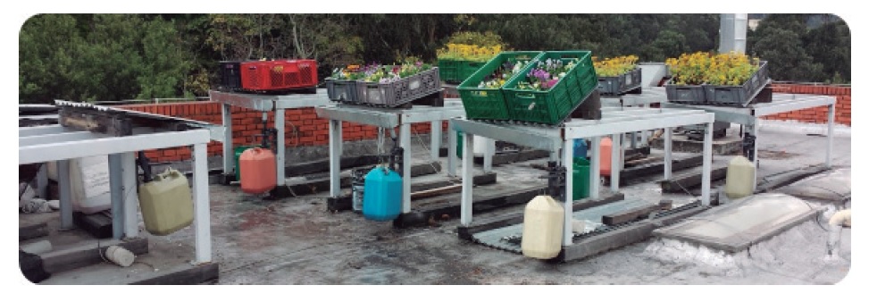 El montaje experimental se ubicó en la terraza del Edificio No. 67 José Rafael Arboleda, de la Pontificia Universidad Javeriana (ver Fig. 1). Consta de siete mesas en perfil metálico, niveladas en plano horizontal y con un marco interno móvil, el cual reposa en un apoyo por un extremo y en una celda de carga por el otro. Sobre cada una de las siete mesas se dispuso una cubierta de zinc de 0,80 m por 0,80 m, inclinada con una pendiente determinada, y sobre ellas se tiene la posibilidad de instalar un módulo unitario de techo ver-de, dejando uno de los módulos únicamente con la cubierta de zinc, con el objeto de que obre como testigo. Cada módulo cuenta con un recipiente para el almacenamiento de la escorrentía superficial, suspendido por un soporte conectado a una celda de carga. Las celdas de carga son sensores de peso que transforman la energía mecánica que ejerce el peso de la cubierta o del recipiente, en energía eléctrica enviando la señal en miliamperios (mA); por lo tanto, es necesario un proceso de calibración para transformar dicha señal eléctrica en volumen de agua. El sistema de adquisición de los datos del monitoreo en continuo permite almacenar un dato (de la señal eléctrica en mA) por minuto y consta de: 1) 8 entradas por módulo; 2) un sistema de alimentación por puerto USB; 3) comunicación modbus, sobre red rs-485; 4) resolución del conversor ADC: 12 bits, y 5) software de captura y visualización de national instruments [16]. Los datos adquiridos con el sistema se almacenan en archivos CSV para su posterior procesamiento
