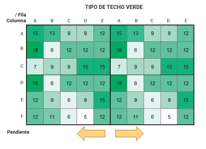 Como se describió anteriormente, es posible alterar el comportamiento hidrológico de los techos verdes extensivos a partir de los factores de diseño como el tipo de planta y la altura del sustrato, lo cual permite la intervención de la ingeniería en el diseño de desarrollos de bajo impacto (LID), aprovechando los beneficios de los techos verdes. Por lo anterior, se desarrolló una herramienta de diseño que discretiza el espacio disponible en una malla del tamaño de los módulos experimentales (cuadrados de 0,8m de lado) y selecciona de manera aleatoria 1000 diferentes combinaciones de tipos de techos verdes (combinación de los factores tipo de planta y altura de sustrato, en cada subárea del enmallado) para ser potencialmente instalados. La herramienta da como resultado las 10 mejores combinaciones de planta y sustrato, utilizando los indicadores hidrológicos como criterios de priorización.
