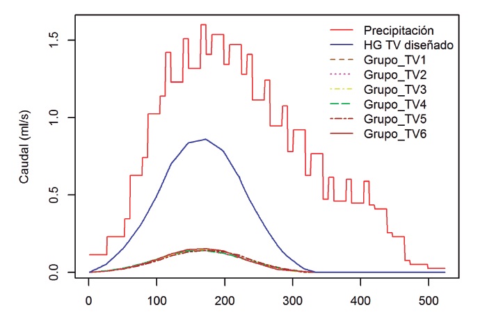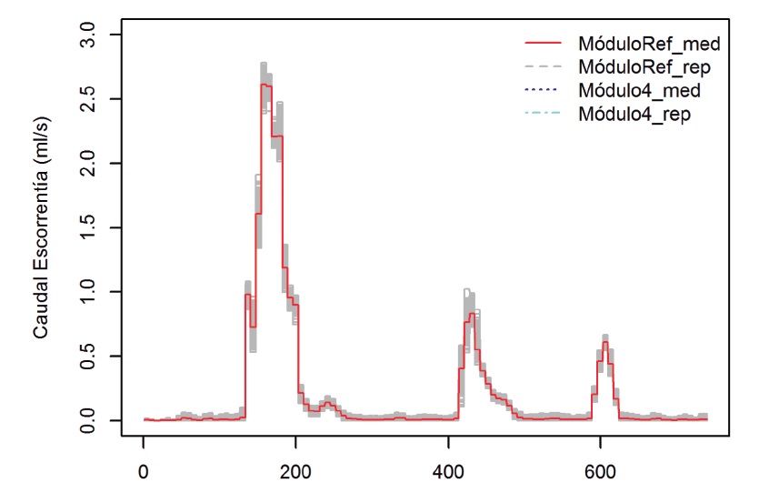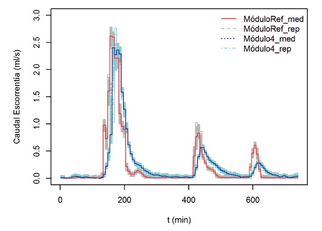 La Fig. 3 muestra con el hidrograma del módulo de referencia (rojo) el pulso de la precipitación de un evento determinado y como ejemplo se compara con el hidrograma del módulo 4 (azul) del montaje experimental, lo que evidencia la reducción del volumen total de escorrentía, la atenuación del caudal máximo y el retraso del hidrograma.