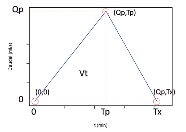 Con las variables e indicadores hidrológicos simulados con la aplicación de las SVM se construyen los hidrogramas sintéticos para cada combinación de los factores de diseño, seis tipos de planta y tres alturas de sustrato, para un total de 18 combinaciones, que se denominarán para este estudio tipo de techo verde. El hidrograma sintético se construye a partir de dos rectas, como se muestra en la Fig. 4. La primera es ascendente y está conformada por el punto de origen (0,0) y el punto conformado por los va- lores del caudal pico y tiempo al caudal pico (Qp,Tp). La segunda es descendente, inicia en el punto anterior (caudal y tiempo pico) y el punto de intersección al eje de caudal, es decir, el caudal donde cesan los efectos de la escorrentía y el tiempo final (0,Tx), que es específico para cada tipo de techo verde y se calcula de forma que el volumen simulado en la SVM sea igual al volumen calculado en el hidrograma sintético.