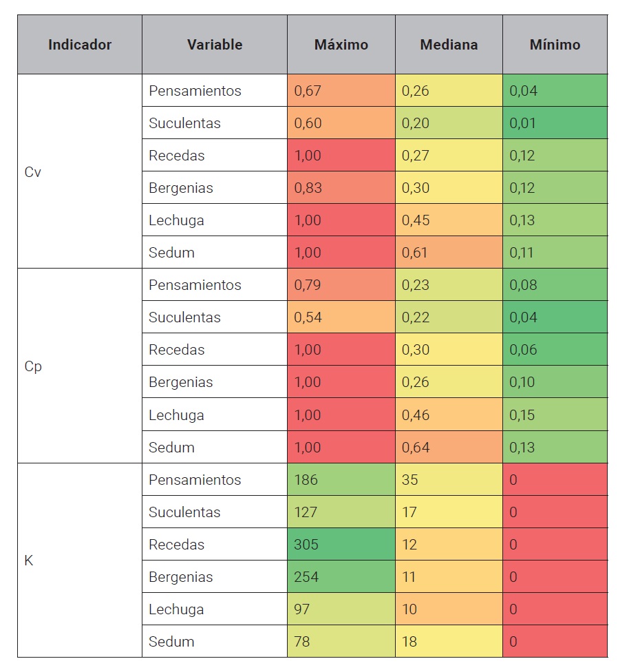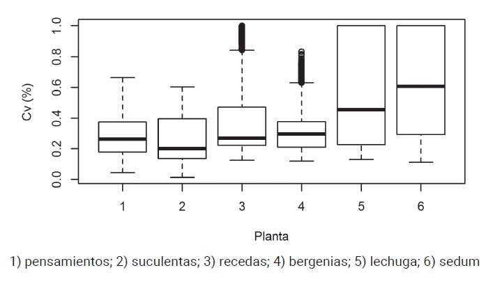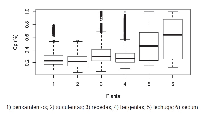 Fuente: elaboración propia.Con la aplicación de la prueba de Wilcoxon se puede determinar que también se presentan diferencias significativas entre los diferentes tipos de plantas utilizados para la investigación (ver Figs 5 y 6). Entre los resultados más relevantes, se tienen las mayores probabilidades (superiores a 0,99) de encontrar diferencias entre el Sedum y los pensamientos y el Sedum y las suculentas. También se encontró diferencia entre la lechuga batavia y las suculentas (probabilidad de 0,67 para Cv y 0.99 para Cp). El test no se aplicó para el tiempo de retraso (K), debido a que el factor “planta” no lo influye de forma significativa. Respecto al test de Spearman, se encontró que tienen probabilidad cierta de correlación con el Cv y el Cp, pero su co-eficiente rho está por debajo del 50 % (0,39 para Cv y 0,42 para Cp).