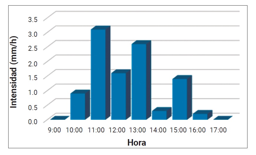 Para la implementación de la herramienta de simulación, se desarrolla un estudio de caso para un evento de precipitación diferente a los monitoreados por el montaje experimental, a partir de los datos de precipitación registrados por la Red de Monitoreo de Calidad de Aire de Bogotá (RMCAB), de la Secretaría Distrital de Ambiente. Para el caso de aplicación, se utilizó el registro del evento de precipitación presentado el 7 de mayo de 2012, el cual se seleccionó arbitrariamente de los años de registro de la estación Sagrado Corazón o MinAmbiente de la RMCAB. Se asume que este evento corresponde a una precipitación de diseño; sin embargo, corresponde al diseñador realizar los cálculos correspondientes a los requerimientos específicos en cada proyecto. El hietograma del evento se presenta en la Fig. 7.
