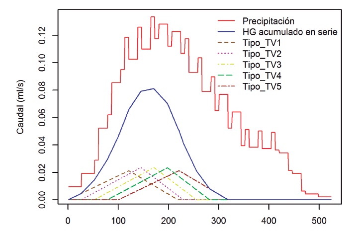 Para este propósito se parte de la superposición de los hidrogramas, que permite analizar el comportamiento de las variables hidrológicas cuando estos efectos se producen en serie o en paralelo. Los arreglos de techos verdes en serie, generan un hidrograma acumulado, sumando los valores de caudal en cada instante. Para el caso de los arreglos en paralelo, la acumulación de los caudales se desplaza en el equivalente al tiempo de retraso o LagTime calculado para cada tipo de techo, con el método descrito.