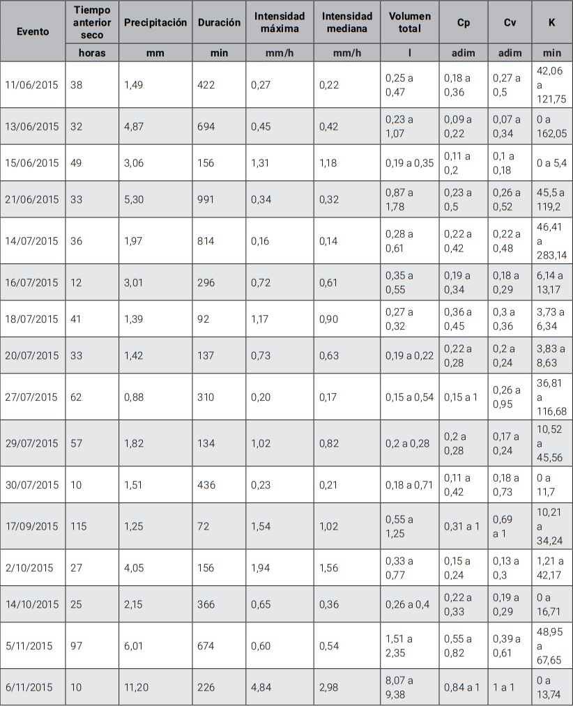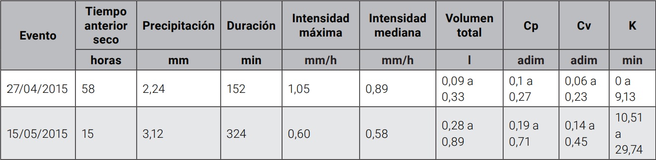 En el proyecto de investigación se requiere determinar las variables hidrológicas de interés para los eventos de lluvia, y para este propósito el monitoreo en continuo del módulo experimental de referencia permite de-terminar las variables que definen el evento, como 1) la precipitación; 2) la duración; 3) la intensidad, y 4) el tiempo anterior seco, como el periodo entre la ocurrencia de los eventos monitoreados. De manera complementaria, los seis módulos experimentales de techos verdes aportan la información de respuesta lluvia-escorrentía. Adicionalmente, a través del monitoreo en continuo, es po-sible realizar los cálculos sincronizados de estas variables y hacer las comparaciones entre el volumen total de escorrentía, el caudal pico y el centroide del hidrograma, lo cual se mide a través de los indicadores del comportamiento hidrológico: 1) coeficiente de escorrentía basado en el volumen (Cv) que se determina por la relación entre el volumen de escorrentía superficial generado por cada módulo de techo verde y el volumen de precipitación medido en el módulo de referencia, 2) el coeficiente de escorrentía basado en el caudal pico o de atenuación (Cp), que corresponde a la relación entre el caudal máximo obtenido en el monitoreo de cada uno de los módulos y la referencia, y 3) el tiempo de retraso (K) que se calcula como el desfase del centroide del hidrograma de precipitación de cada módulo, respecto a la referencia. A pesar de que estas variables son de uso común en la gestión del recurso hídrico, el proceso de obtención de información primaria a partir de un montaje experimental y las necesidades particulares de procesamiento de datos han requerido la adaptación y complementación de los métodos convencionales, para la inclusión del método numérico de propagación de la incertidumbre, el suavizado de la señal eléctrica, entre otros.