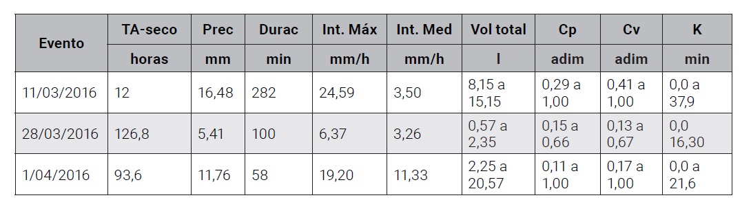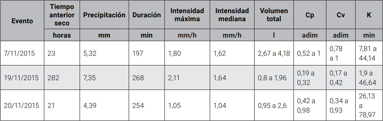El coeficiente de escorrentía basado en el volumen total (Cv) se determina por la relación entre el volumen de escorrentía superficial generado por cada módulo de techo ver-de y el volumen de precipitación del módulo de referencia. Como una diferenciación de la variable de respuesta anterior, se calculó el coeficiente de escorrentía basado en el caudal pico (Cp), que corresponde a la relación entre el caudal máximo obtenido en el monitoreo de cada uno de los módulos de techos verdes y el módulo de referencia. El desfase presentado en comparación con el centroide del hidrograma de la precipitación medido en el módulo de referencia y el centroide del hidrograma de la escorrentía superficial de los módulos con techos verdes es interpretado como el tiempo de retraso (LagTime o K).