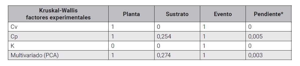 Los resultados de la prueba de Kruskal-Wallis presentados en la Tabla 2 muestran que el factor “planta” tiene una probabilidad cierta (100 %) de ser altamente significativa para los indicadores de Cv y Cp, pero en contraste se tiene una probabilidad nula respecto al K. Se desarrolló una agrupación de las tres variables de respuesta mediante el análisis de componentes principales y se obtuvo que el factor “planta” tiene una probabilidad de 1 (100 %) de ser altamente significativa para el componente principal que representa los tres indicadores del comportamiento hidrológico.