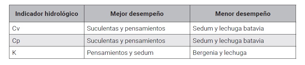 A partir de los resultados anteriores, la Tabla 3 presenta el consolidado de los resultados de los indicadores del comportamiento hidrológico, obtenidos con cada una de las seis plantas seleccionadas para el proyecto, y se relacionan los valores máximo, mediano y mínimo que corresponden al límite superior del diagrama de caja, segundo cuartil y límite inferior de toda la serie de datos disponible. Teniendo en cuenta los resultados anteriores, en la Tabla 4 se presenta un consolidado de los tipos de plantas que presentan los mejores y menores desempeños para la atenuación de la escorrentía, por cada indicador hidrológico.